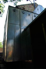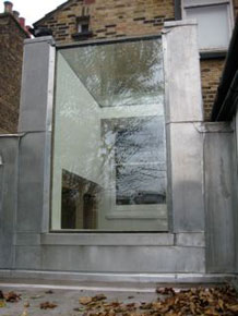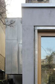 Moving Architecture from Clarence Mews manipulated the planners in their particular way. Cabinet makers Joshua Dumond and Lars Frideen, also based in Clarence Mews constructed the music box and windows. Ray Shepherd was the remarkable main contractor. He helped with Hackney based octagarian coppersmith, Terry Bennett (he worked on the Festival Hall Roof) who manipulated the zinc into its position. Hackney resident Adaesi Ukairo, a sculptor in metals, created the copper panel 'Moving 3'. Hemp insulation was inserted into the engineered timber frame and panelvent was used for sheathing to allow the wall to 'breathe'. The outer cladding was a combination of plywood and zinc. Internally (box and floor) and on the windows oak was used with walnut in the kitchen. The budget was a tight £60,000.