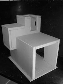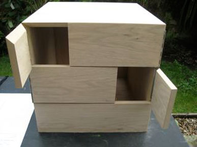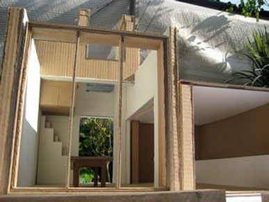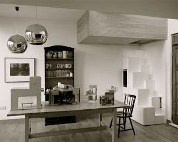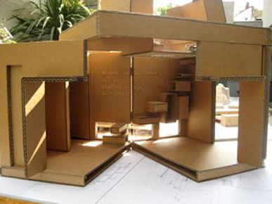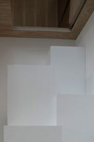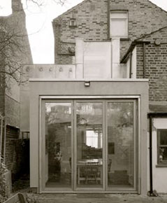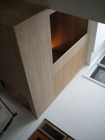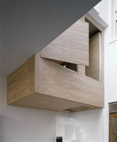A 'local' Hackney project, the clients were an extended musical family with jazz musicians, a classical and modern composer, and BBC music producer. The project started as a new dining space, but evolved into a mediated interlude. The new space links from the music studio (first floor), grand piano (ground floor), to the dining and kitchen via a music box . The cube is a 2m cube that can be a musicians gallery, sleep space or meditative escape. It sits out over the alleyway between the houses and opens up into a double height space. This tall chamber has light from the north sky, a window to the studio, a copper relief panel, 'Moving 3', and the oak shutters of the music box opening into it. The construction used many Hackney connections and techniques.